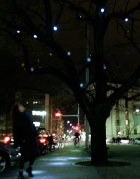 The lime tree on Place René Payot has a cold! The tree naked in winter is inhabited by about fifty white light LED spots that pulsate and flash. Interpreted by the Lausanne musician Daniel Bourquin (alias Nunus), we can hear it sniff, moan at distance. It calls out to us, complains, hums and sneezes violently when we pass under its branches ... The points of light are animated during the sample of voices and illuminate the sidewalk, then resume a calm sparkle as if the tree thought, breathed ...