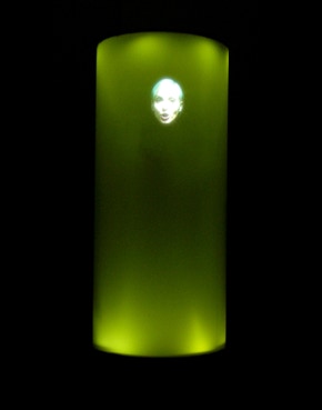 I was working on the subject of war, totalitarian power and megalomania, I am referencing both history and science fiction (Orwell's 1984). As a performance artist, I am interested in the actor-audience relationship (the virtuality of the speaker; of space, time, and spectacle.) I have composed a musical and visual piece using a hypnotizing voice and presence. The audience is immersed in the dark and held captive by the appearance of my face on the surface of a large tube in the middle of the room. The cylinder is animated from within by a variety of colorful lights. My face looks out at the public; it delivers speeches, sings patriotic hymns and chants military marches. Speakers are hidden in the bottom and top of the construction, and a motorized mirror inside of the cylinder allows the face to move on all the circumference of the construction.
