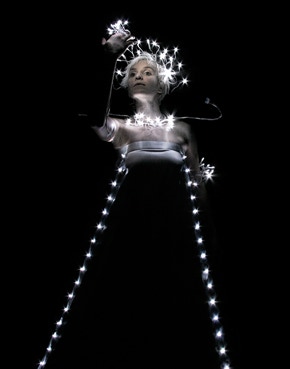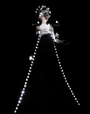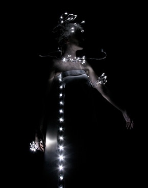 J’ai confectionné différents bijoux avec du fil électrique et des LED blanches, ainsi qu’une longue robe pyramidale en satin ornée des mêmes LED. Ces accessoires s’illuminent en fonction de ma partition, ils sont commandés un à un, en direct et à distance, par mon assistant. L’éclairage de la robe est divisé en trois zones qui clignotent en suivant mon chant.