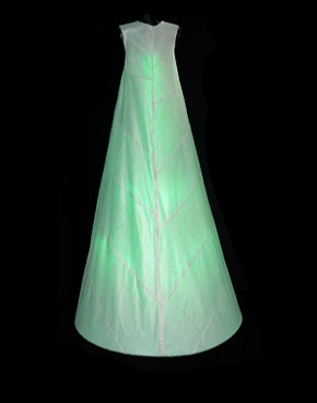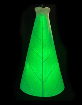 Une grande robe nervurée comme une feuille, réalisée en géotextile, est suspendue à vingt centimètres du sol, ce qui lui confère une présence fantomatique. Une lumière verte qui s’élance vers le ciel la remplit progressivement. Comme une présence surnaturelle, la robe-feuille s’anime et prend vie soudainement. Elle respire pour quelques battements avant de s’éteindre lentement et laisser place à d’autres vagues énergisantes. Les nuances de verts qui la traversent évoquent autant la verdure des prairies, que les enseignes lumineuses de pharmacies. L’installation met en scène notre lien au végétal, aux plantes et aux fibres, qui nous soignent et nous habillent.