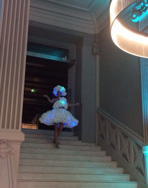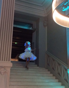 Je déambule dans la ville vêtue d’un costume aux apparences de nuages qui pulse et s’illumine de l’intérieur. Réalisé en mousse expansive comme des amas de pollutions mentales accrochées à mon corps, il est traversé de part et d’autres de lumières bleutées qui émanent du cœur de la matière.