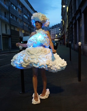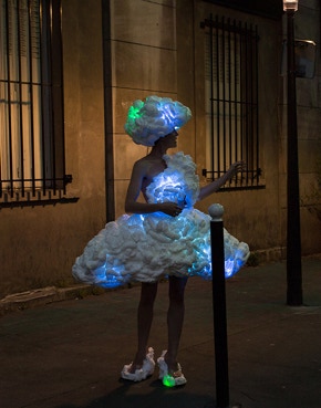In search of a more serene horizon, I wander in the city dressed in a costume with the appearance of clouds that pulsates and lights up from the inside. Made of expansive foam like clusters of mental pollution hanging on my body, it is animated by bluish lights that emanate from the heart of the matter. This charged electricity alludes to the storms and gaseous reactions of the cosmos.