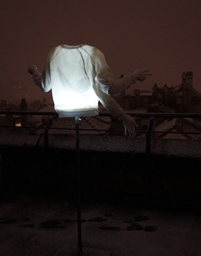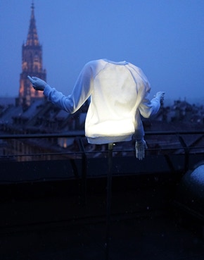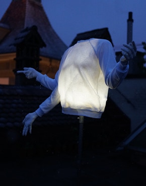 Un buste à trois bras, habillé d’un sweat blanc comme neige est exposé sur une terrasse. Il surplombe la vieille ville de Berne et fait face aux Alpes enneigées. Devant ce majestueux panorama, la sculpture sans tête s’illumine de l’intérieur et pulse lentement d’une douce lumière couleur de lune. Cette œuvre exprime le temps qui passe, qui presse parfois. Savons-nous nous arrêter un instant pour méditer, se poser pour faire les bons choix ? Quel virage prendre ? Pour moi ? Et pour le climat ? Par ici ? Par là ? Que me dit ma boussole ? Ici, c’est le ventre, le deuxième cerveau qui respire, puis guide.