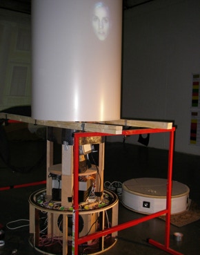 I was working on the subject of war, totalitarian power and megalomania, I am referencing both history and science fiction (Orwell's 1984). As a performance artist, I am interested in the actor-audience relationship (the virtuality of the speaker; of space, time, and spectacle.) I have composed a musical and visual piece using a hypnotizing voice and presence. The audience is immersed in the dark and held captive by the appearance of my face on the surface of a large tube in the middle of the room. The cylinder is animated from within by a variety of colorful lights. My face looks out at the public; it delivers speeches, sings patriotic hymns and chants military marches. Speakers are hidden in the bottom and top of the construction, and a motorized mirror inside of the cylinder allows the face to move on all the circumference of the construction.