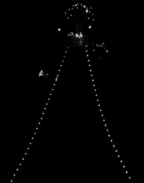 J’ai confectionné différents bijoux avec du fil électrique et des LED blanches, ainsi qu’une longue robe pyramidale en satin ornée des mêmes LED. Ces accessoires s’illuminent en fonction de ma partition, ils sont commandés un à un, en direct et à distance, par mon assistant. L’éclairage de la robe est divisé en trois zones qui clignotent en suivant mon chant.