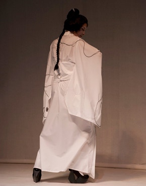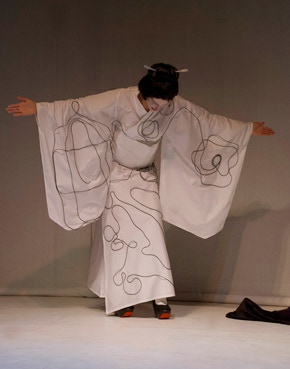 Je chante mes textes courts, sortes de haïkus en français, sur une musique jouée au koto de Sawai Hikaru. Je me déplace lentement sur la scène, tout en présentant un à un les dessins aux spectateurs. Tout en dansant, je fais circuler de l’encre noire dans de fins tuyaux en silicone cousus sur mon kimono blanc. L’encre révèle progressivement des motifs figuratifs sur les manches, le devant et le dos de celui-ci. En m’Inspirant de la danse traditionnelle japonaise , je propose une réflexion sur les opposés et complémentaires (vide-plein, homme-femme, ville-campagne, etc.). A la recherche du zen, j’évoque ma vie nouvelle à Paris, et témoigne des lieux qui m’attirent en ce début d’automne. Je parle de la ville, de ses parcs, de ses jardins, de ses ruches, de ses musées et de ses initiatives écologiques.