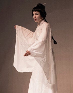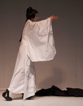 While dancing to my choreography, I inject black and red ink through very thin, transparent tubes of silicone that are sewn onto the large white kimono I wear. The flowing ink reveals drawings that appear as if by magic on the different parts of my kimono. While presenting the images one by one to the public, I dance and slowly move with all the traditional calm of the Empire of the Rising Sun. The figurative motifs revealed respond to my songs and my haiku recited in French to a piece for koto by the Japanese composer Sawai Hikaru. This performance with Zen inspirations is the fruit of introspection and a work of self-irony. I invoke my new life in Paris, my plans and activities in this beautiful and multicultural city. I refer to the places I like, which attract me or calm me in this early autumn. I chose the traditional Japanese costume as a visual support to the story I tell.