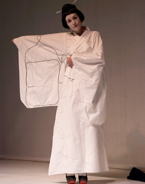 Femme en kimono, femme de tuyaux. Dans la performance Evidence, Geneviève Favre Petroff fait de petits mouvements en chantant. Son costume se colore peu à peu de «broderies» réalisées par la circulation spiralée de fluides. Comme si, le réseau sanguin se transformait en motifs décoratifs vivifiant le monochrome blanc du kimono. A la fois incongrue et élégante, Evidence offre un moment de magie.