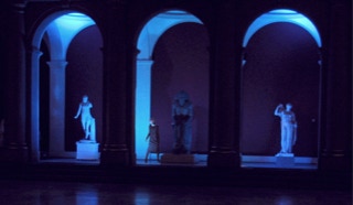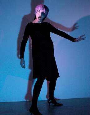 Inspired by the Modern Greek myth of the Gorgon, I created a hybrid character: a beast evolving in an aquatic atmosphere. Pregnant, I felt myself to be half-woman, half animal, and I developed a special timbre for my voice to express the sensation of this changing body. In a violet light, the creature arrives on stage accompanied by groans and superimposed voices. Its songs intoxicate the visitors, and its words, infused with pain and fear, inspire respect and empathy. Seeming to have appeared from nowhere, Gorgona terrorizes the assembly for some minutes, then leaves the scene with a strident cry.
