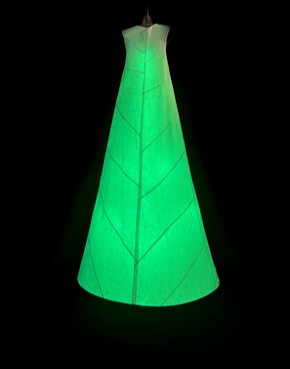 Une grande robe nervurée comme une feuille, réalisée en géotextile, est suspendue à vingt centimètres du sol, ce qui lui confère une présence fantomatique. Une lumière verte qui s’élance vers le ciel la remplit progressivement. Comme une présence surnaturelle, la robe-feuille s’anime et prend vie soudainement. Elle respire pour quelques battements avant de s’éteindre lentement et laisser place à d’autres vagues énergisantes. Les nuances de verts qui la traversent évoquent autant la verdure des prairies, que les enseignes lumineuses de pharmacies. L’installation met en scène notre lien au végétal, aux plantes et aux fibres, qui nous soignent et nous habillent.