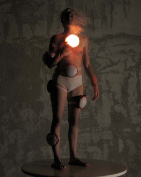 Je propose un jeu scénique sur le sujet de l’assainissement corporel et de l’hygiène mentale. En lien avec le cliché de la propreté en Suisse mais aussi de la cohabitation des langues et des cultures au sein même du pays, j’ai écrit une pièce absurde pour sept lampes à pression disposées sur mon corps comme des boutons, des prothèses, en lien avec les points sensibles d’acupuncture. À chaque lampe, j’associe une phrase mélodique que je chante en allemand ou en français lorsqu’elle est allumée, et que j’interromps lorsque je réappuie sur la même lampe et l’éteins.